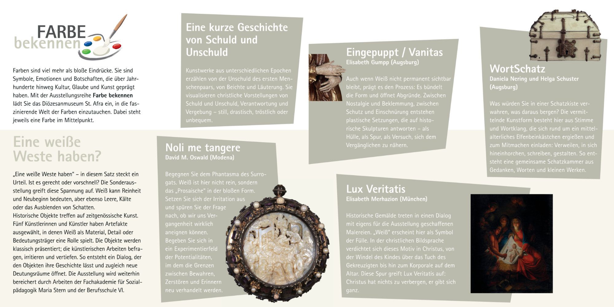 Farben sind viel mehr als bloße Eindrücke. Sie sind Symbole, Emotionen und Botschaften, die über Jahrhunderte hinweg Kultur, Glaube und Kunst geprägt haben. Mit der Ausstellungsreihe Farbe bekennen lädt Sie das Diözesanmuseum St. Afra ein, in die faszinierende Welt der Farben einzutauchen. Dabei steht jeweils eine Farbe im Mittelpunkt.